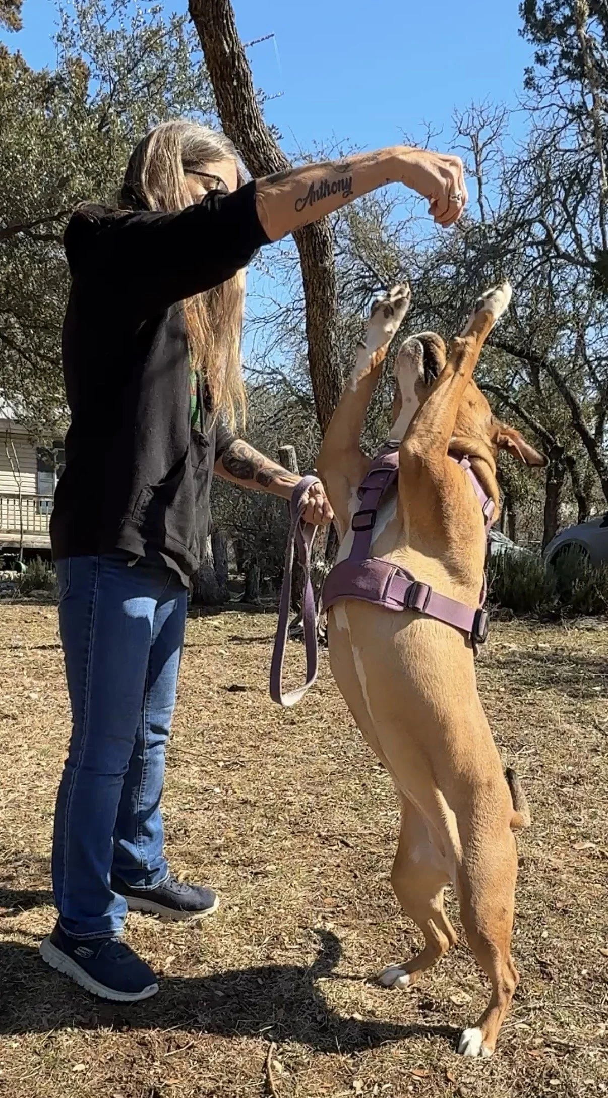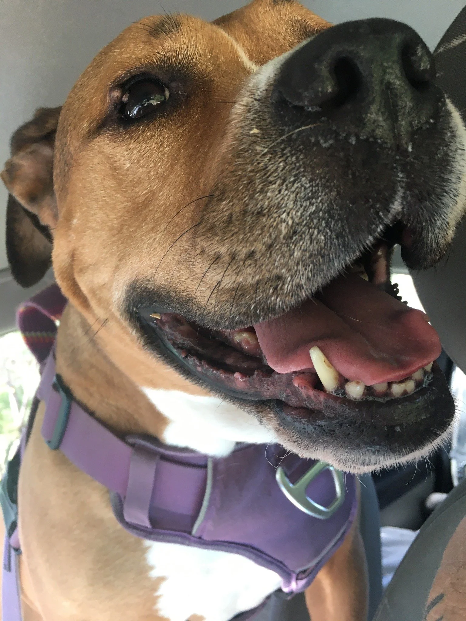 Bella came to us from a local shelter. Being a Pittie was working against the likelihood of adoption. Bella was attacked at a dog park leading to trauma and occasional dog reactivity. Bella is 65+ pounds of solid muscle and love. Bella is a huge ball enthusiast and loves to demolish stuffies. She enjoys car rides with her bestie, Fallon. Bella is currently in need of TPLO surgery.